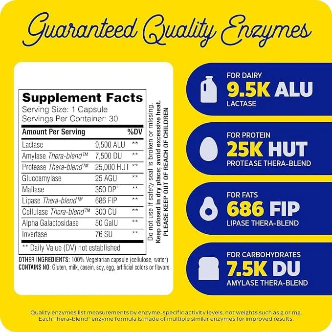 This product is ideal for people with lactose intolerance or difficulty digesting dairy. Each vegetable capsule is filled with multiple strains of enzymes, including Lactase, Protease Thera-blend, Amylase Thera-blend, Glucoamylase, Alpha-Galactosidase, and Maltase. Together, these enzymes support effective lactose, casein and fat digestion.