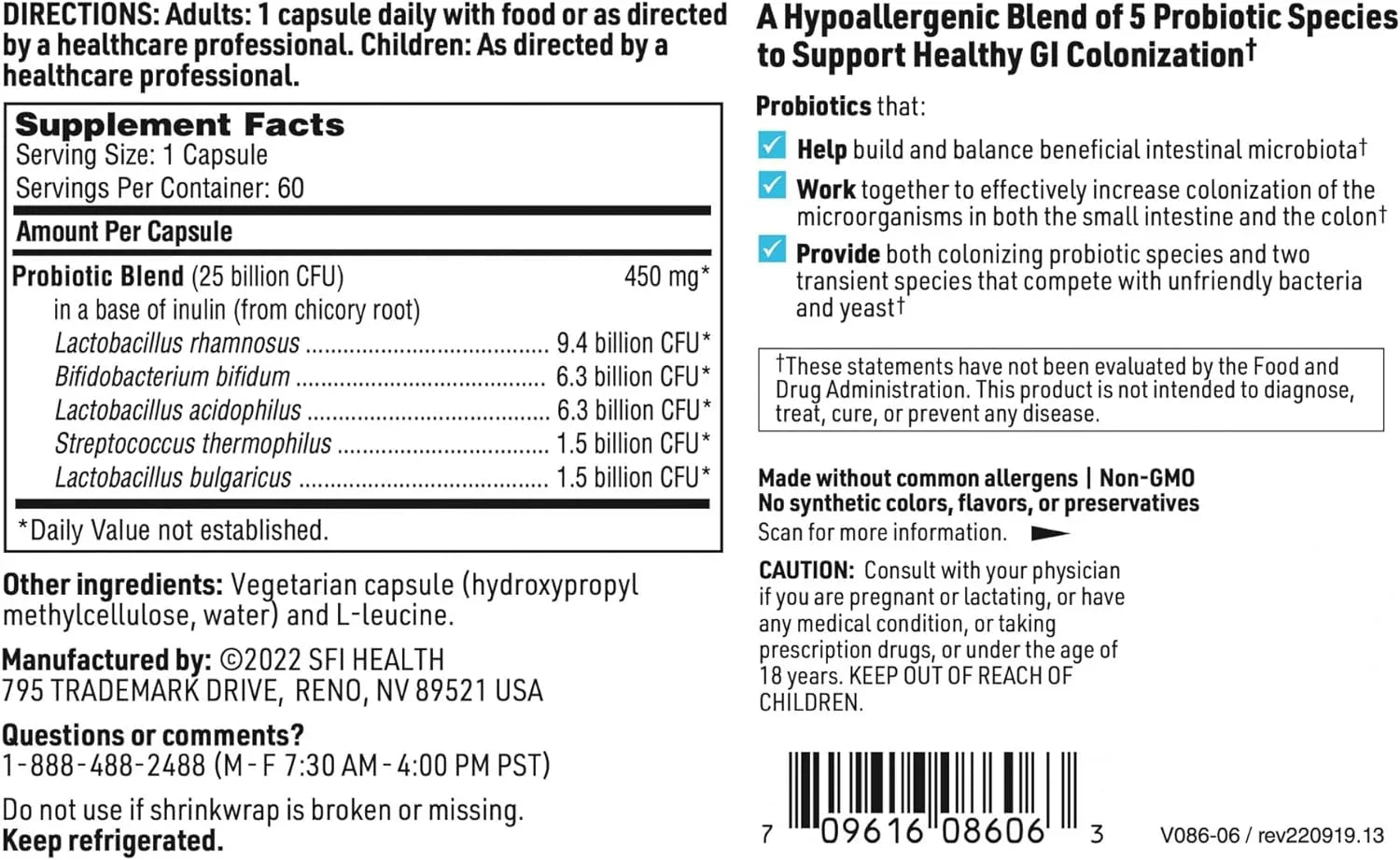 The product does not contain milk, casein, fish, shellfish, tree nuts, peanuts, wheat, gluten, and soybeans. Additionally, it is free from artificial colors, flavors, and preservatives. The manufacturer suggests refrigerating these capsules to maintain potency. The product is hypoallergenic and ideal for those with sensitive digestive systems or those following restrictive diets, catering to many food intolerances and allergies.