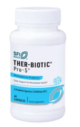 PRO-5, 60 Caps by Klaire Labs is a dietary supplement product intended to support gut health and intestinal balance. Each bottle contains 60 capsules, providing a month's supply based on the recommended dosage of 2 per day. The supplement features a blend of five types of probiotics, including L. rhamnosus, B. bifidum, L. acidophilus, L. casei, and B. longum, with a total of 25+ billion CFUs (colony forming units) per capsule.