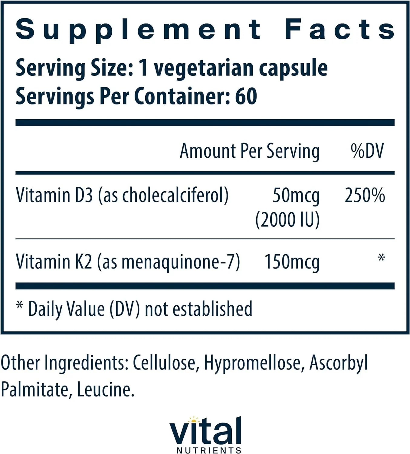 Vitamin K2-7 + D3 by Vital Nutrients provides 60 vegetarian capsules formulated to support bone and cardiovascular health. Each capsule contains 180 mcg of Vitamin K2 as Menaquinone-7 and 2,500 IU (62.5 mcg) of Vitamin D3. Vitamin K2-7 plays a role in directing calcium to the bones and teeth and away from arteries and soft tissues. Vitamin D3 supports calcium absorption in the intestines. Together, these vitamins work synergistically to maintain proper calcium metabolism.