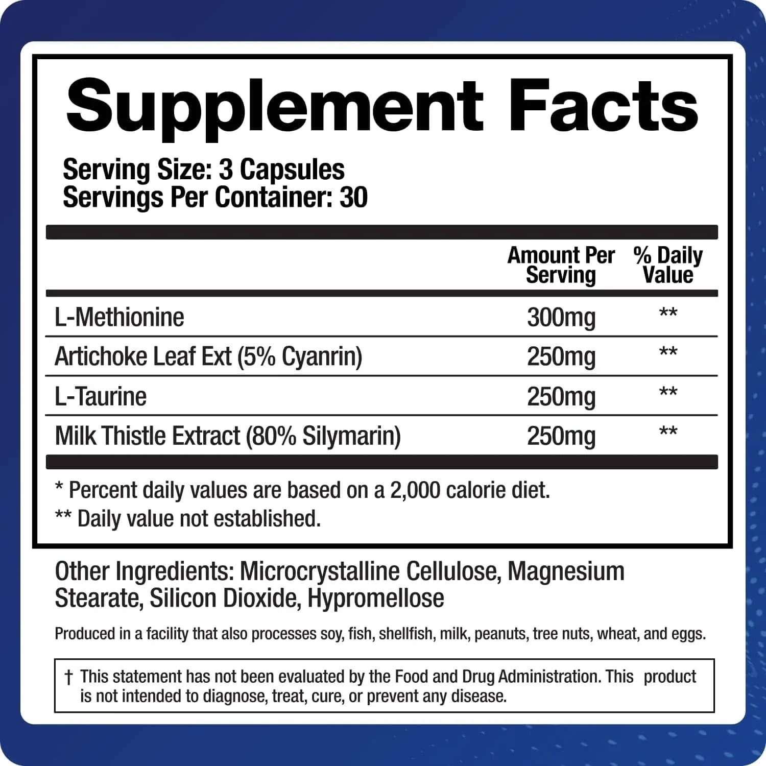 Milk thistle extract is standardized to contain 80% silymarin, which is known for its antioxidant properties and its role in supporting liver function. N-acetyl cysteine (NAC) is a precursor to glutathione, a potent antioxidant that is critical for liver detoxification processes. Alpha-lipoic acid is included for its ability to act as an antioxidant and support liver health by helping to regenerate other antioxidants.