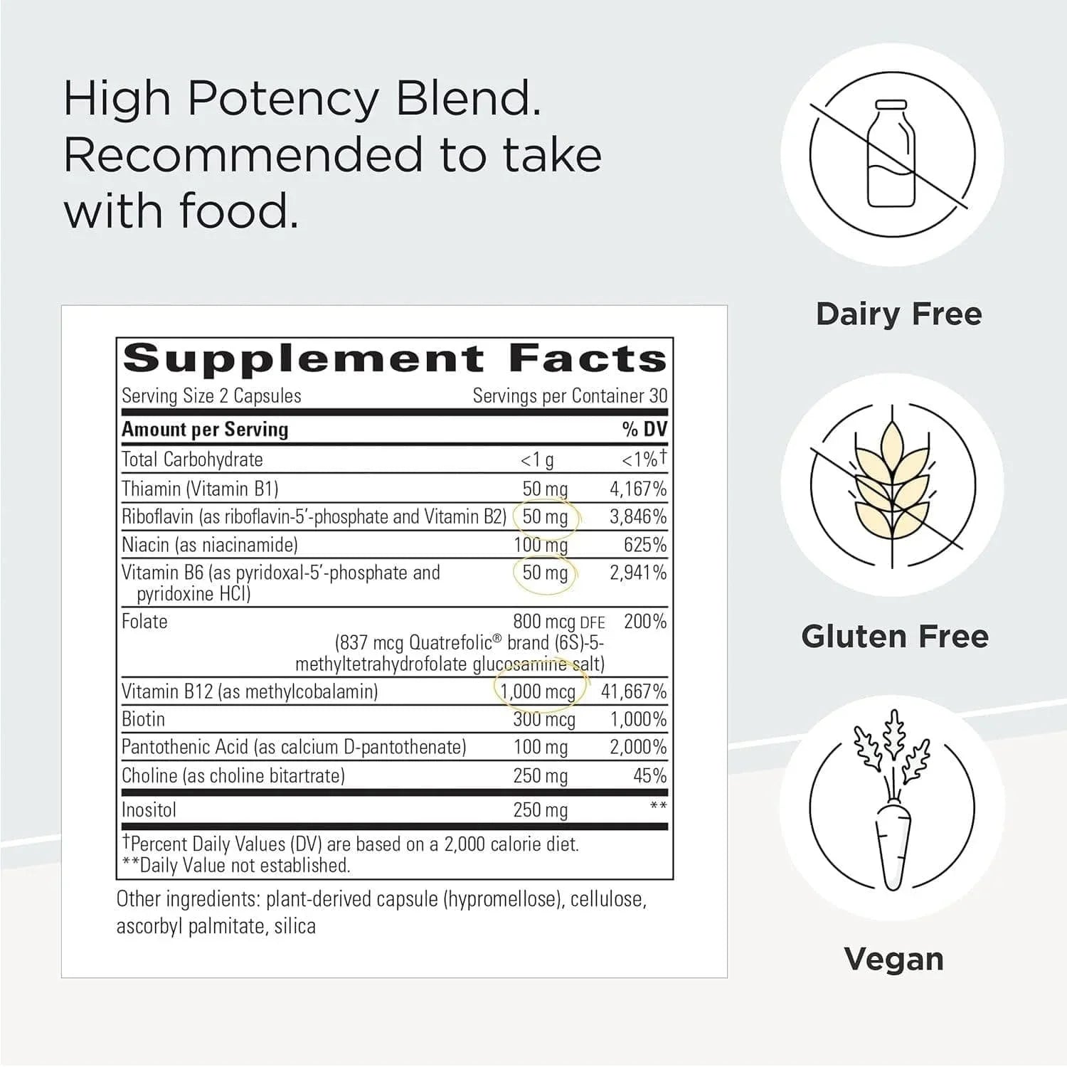 The product contains B vitamins, in their most active forms, which include Thiamin (Vitamin B1), Riboflavin (Vitamin B2), Niacin (Vitamin B3), Pantothenic Acid (Vitamin B5), Pyridoxine (Vitamin B6), Folic Acid (Vitamin B9), Cyanocobalamin (Vitamin B12), and Biotin (Vitamin B7). Other ingredients in the formulation include plant-derived capsule (hypromellose), cellulose, and calcium laurate.