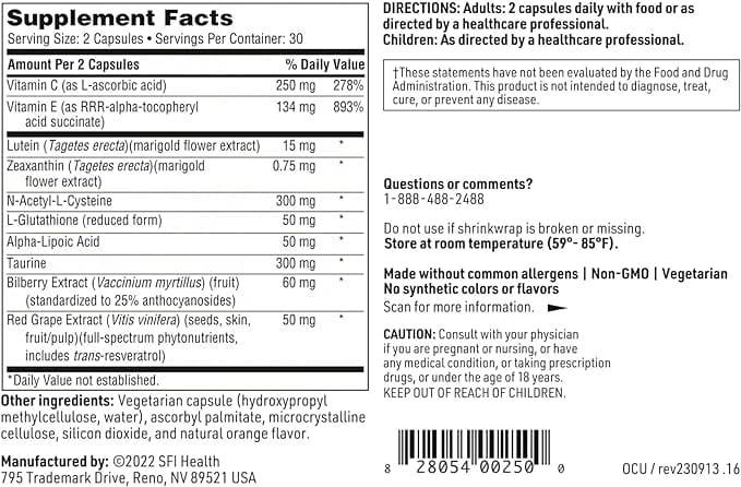 OcuThera is free from common allergens like milk, eggs, fish, shellfish, tree nuts, peanuts, wheat, and soybeans. It's also gluten-free, making it suitable for those with certain dietary restrictions. The recommended dosage is two capsules daily with food or as directed by a healthcare professional.