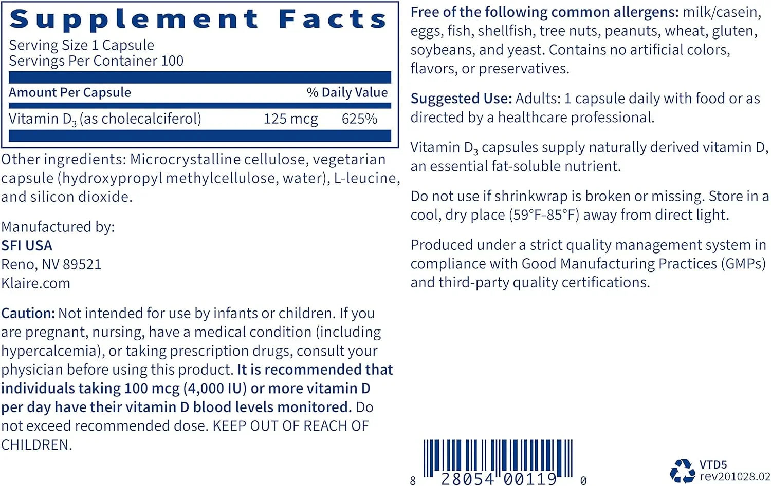 Klaire Labs Vitamin D3 (5,000 IU) - 100 Capsules - SOI*)