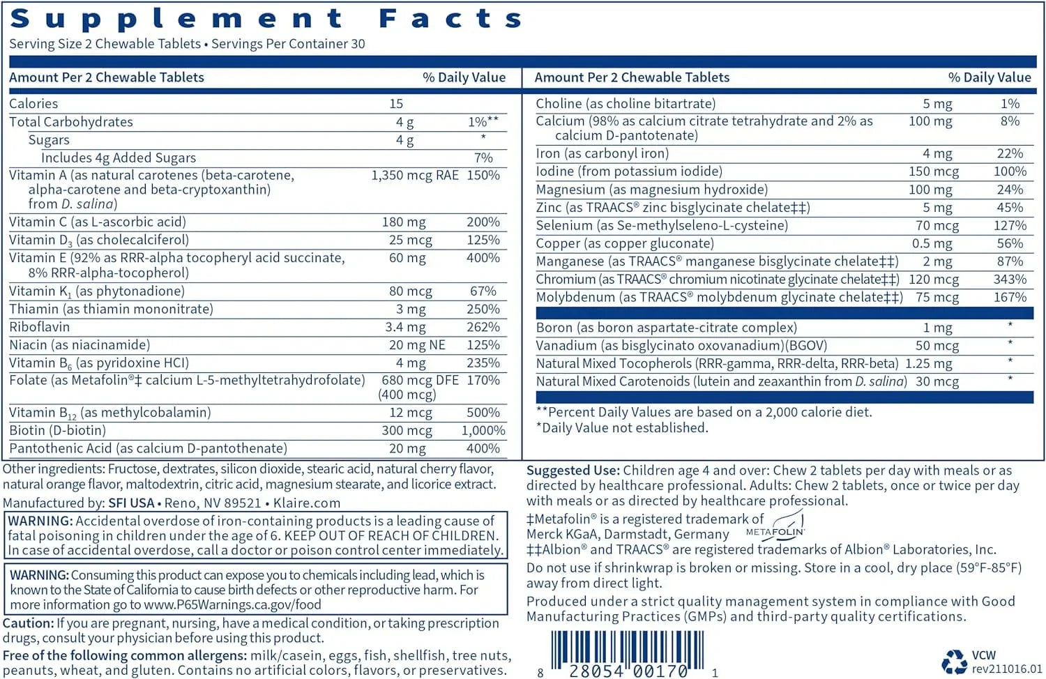VitaTab Chewable, 60 Tablets - Klaire Labs is a dietary supplement designed to provide essential vitamins and minerals for children and adults who prefer a chewable tablet. This product is formulated with a balance of nutrients to support overall health and wellbeing.