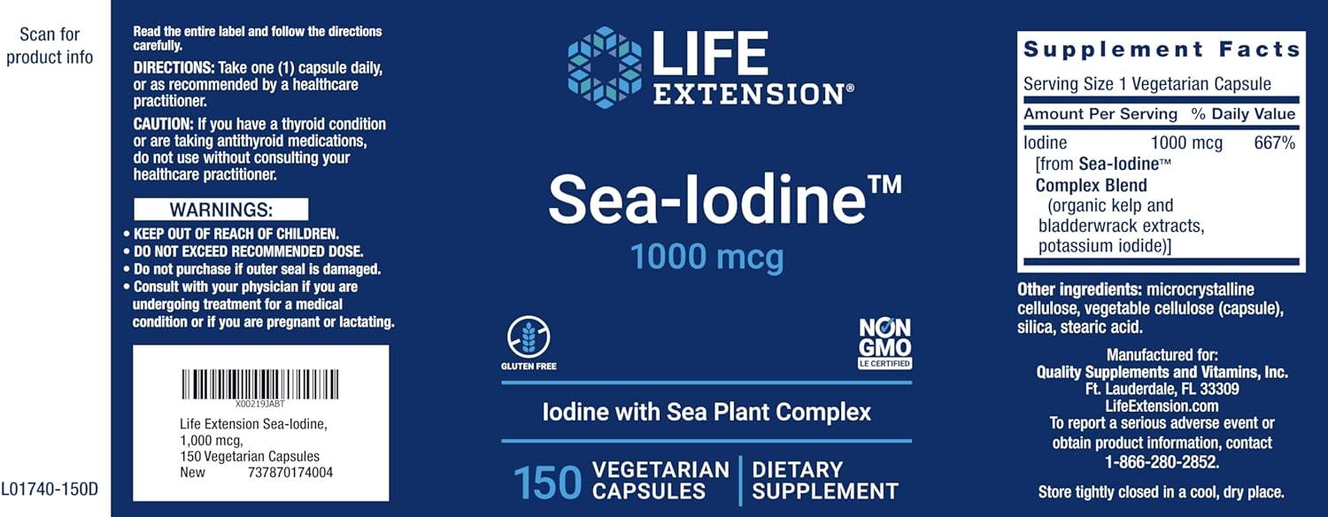Sea-Iodine, 1000 mcg, 60 Caps - Life Extension is a dietary supplement that aims to fulfill requirement of iodine for optimal health. Each bottle consists of 60 capsules, providing a 60-day supply if consumed as suggested (one a day). The key component, iodine, is measured at a robust 1000 micrograms (mcg) per capsule.