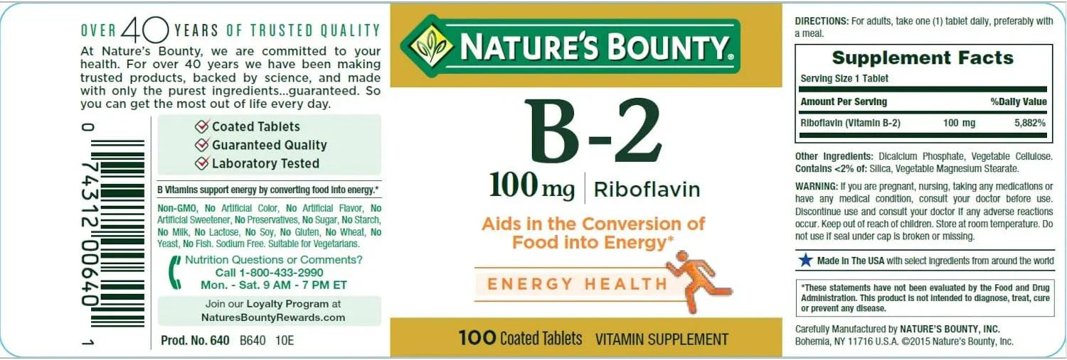 Overall, Nature's Bounty Vitamin B-2, 100mg, 100 Tablets offers a convenient way for individuals to ensure they are getting an adequate intake of this important nutrient. It is not intended to diagnose, treat, cure, or prevent any disease. Also, it is always essential to remember that dietary supplements are not replacements for a balanced diet and healthy lifestyle.
