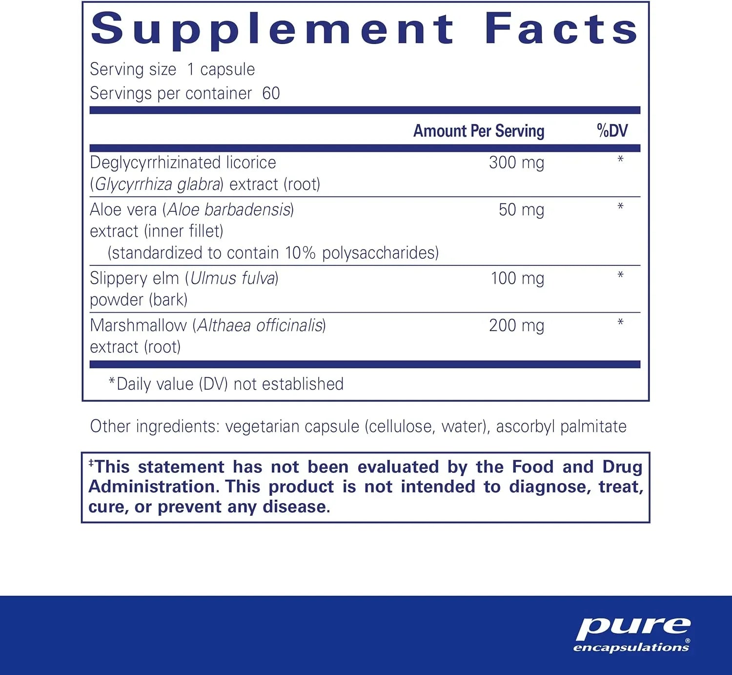 The DGL in the formula is a form of licorice root that has been processed to remove glycyrrhiza - a compound that can raise blood pressure. Marshmallow root and slippery elm bark are mucilaginous herbs that are traditionally used for their soothing and protective effects on the gastrointestinal lining. Aloe vera further supports digestive health.