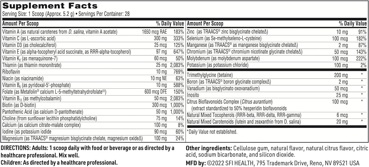 The primary offering in VitaSpectrum Powder is its multi-nutrient formula, which includes nutritional needs like Vitamins A, C, D3, E, B6, and B12, along with trace minerals like Zinc, Selenium, Manganese and more. It also contains a mix of antioxidant-rich pomegranate and berry extracts, which gives it a vibrant berry-pomegranate taste and enhances the nutritional benefits.