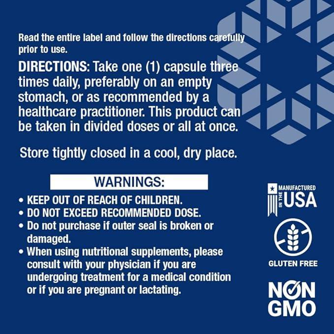 The capsules are suitable for vegetarians and manufactured to meet high-quality standards. The ingredients are derived from non-GMO sources and are gluten-free. The suggested dosage is one capsule one to four times daily, preferably on an empty stomach. The product does not contain artificial colors, flavors, or preservatives.