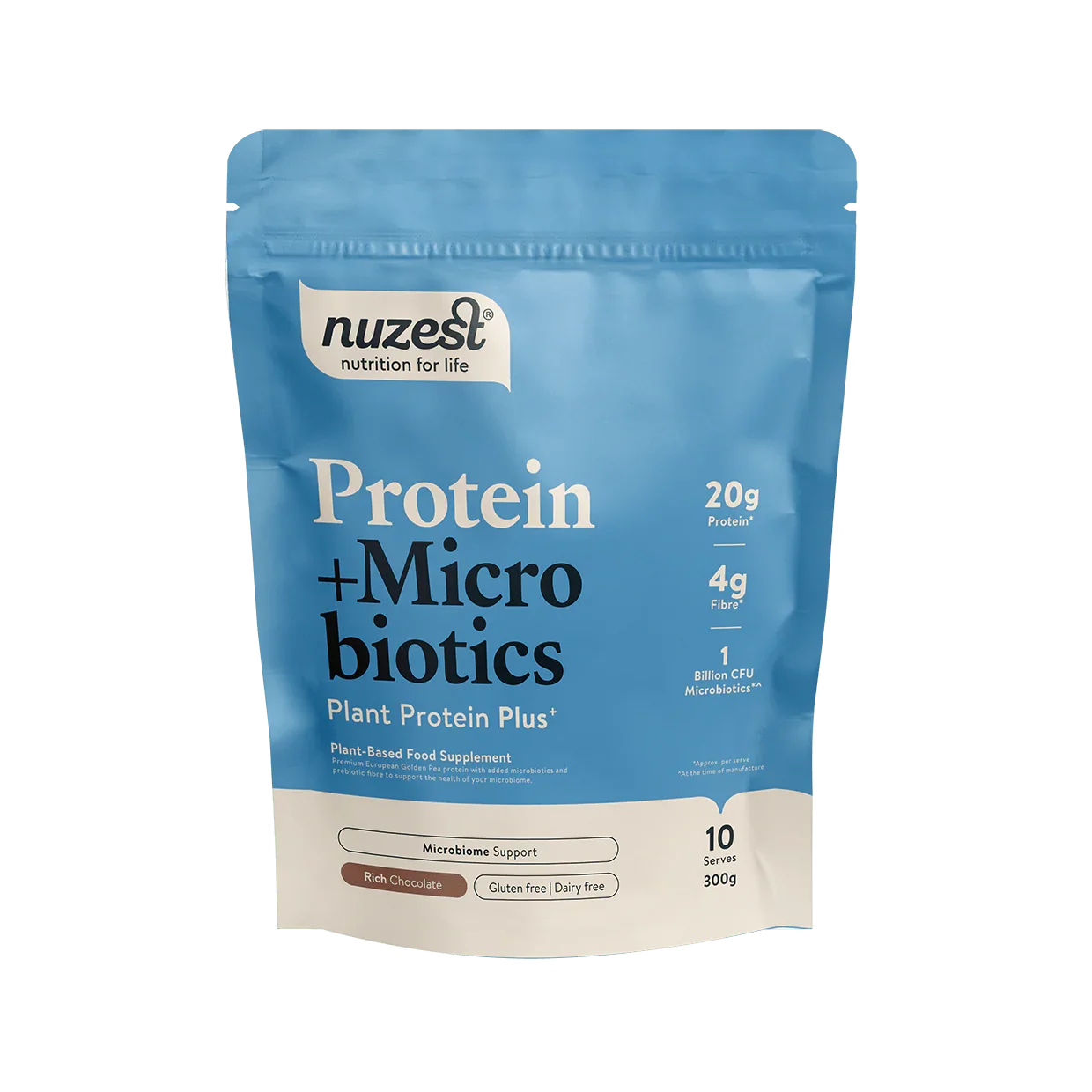 Nuzest's 300g Protein Plus Microbiotics in Rich Chocolate flavor is a premium protein supplement designed to support overall health and wellness. This product combines high-quality pea protein isolate with probiotics to promote muscle recovery and digestive health. Each serving delivers 20 grams of plant-based protein, derived from European Golden Peas, making it suitable for vegetarians and vegans. The protein content supports muscle maintenance and growth while being gentle on the digestive system.