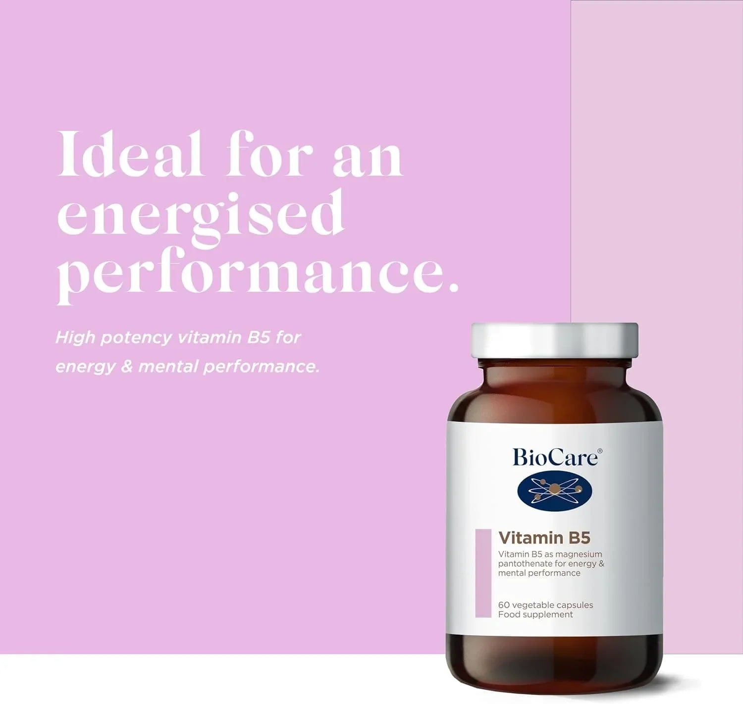Vitamin B5 60 Caps - Biocare is a dietary supplement that contains high potency Pantothenic Acid (vitamin B5). Vitamin B5 is one of the B vitamins involved in the conversion process of food into energy and is necessary for the normal functioning of the adrenal gland. Each capsule of Vitamin B5 60 Caps - Biocare provides 500mg of Pantothenic Acid, which contributes to the reduction of tiredness and fatigue, enhances mental performance, and supports the immune system.