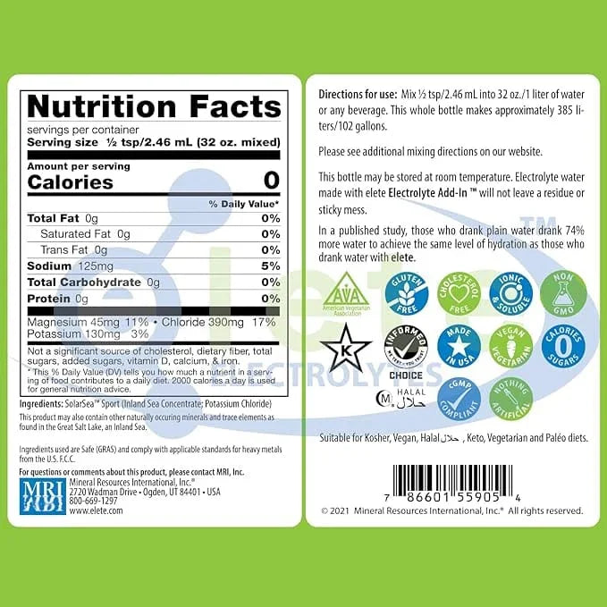 The elete Electrolyte does not contain any sugars, calories, or artificial ingredients, ensuring a clean, healthy hydration option. This product can be mixed with any drink or food and does not affect the flavor, hence offering a versatile means of maintaining electrolyte levels.