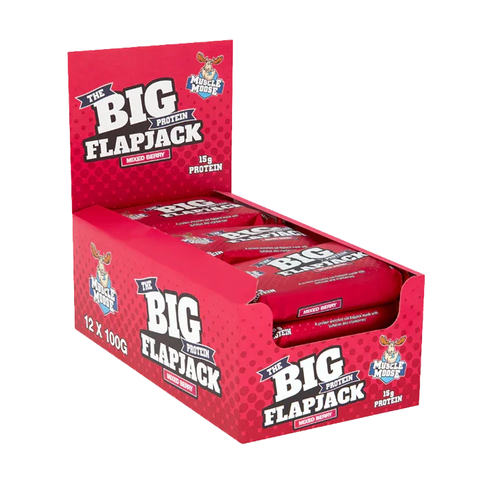 Muscle Moose Big Protein Flapjack 12x100g is a high-protein nutritional supplement designed for health-conscious individuals seeking a convenient and tasty way to support their fitness goals. Each flapjack is packed with 20g of protein, making it an excellent choice for those looking to increase their protein intake. The main active ingredient, whey protein concentrate, is known for its high biological value, ensuring efficient absorption and utilisation by the body.